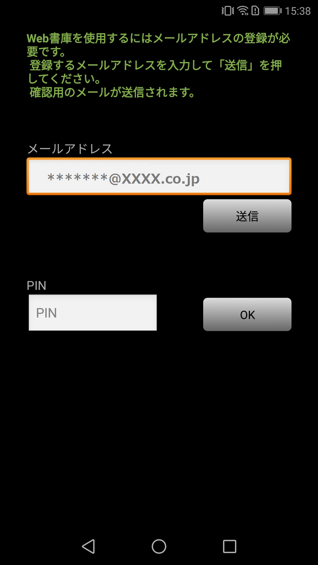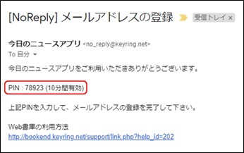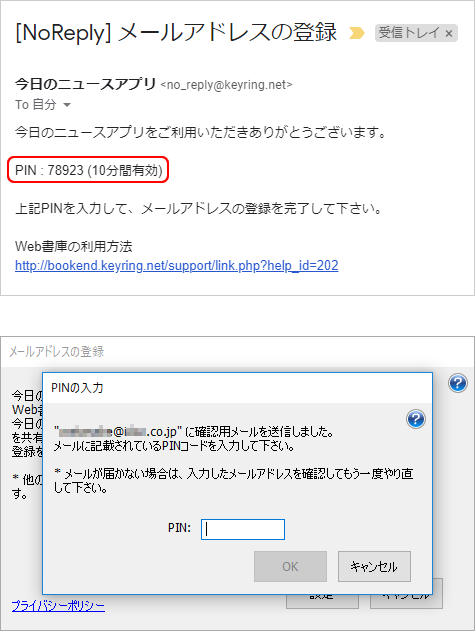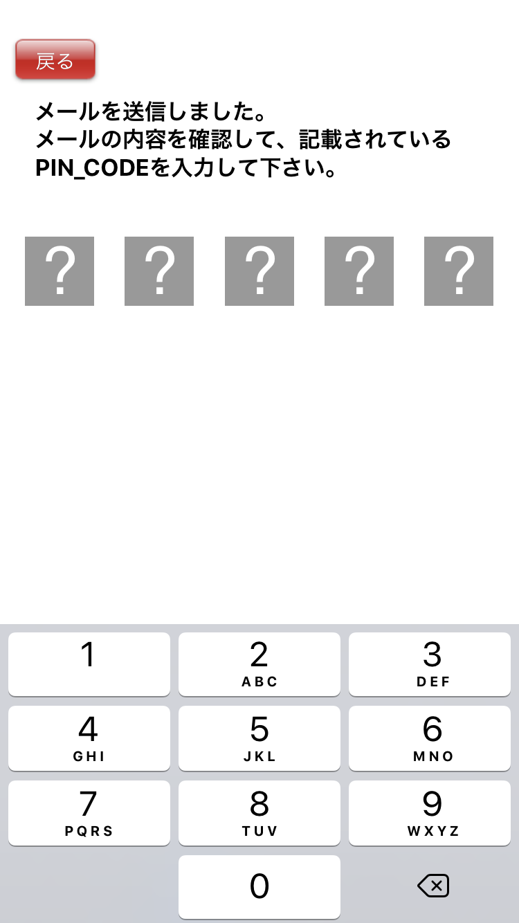 入力したアドレスにメールで数字5桁のPINコード届きますので、アプリに入力します。