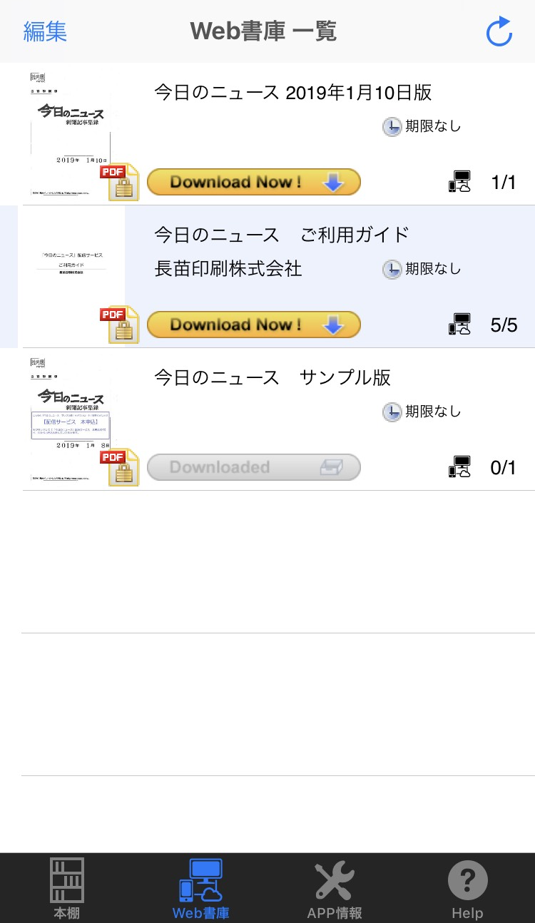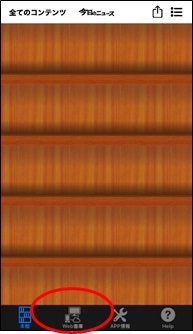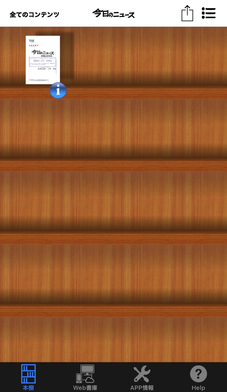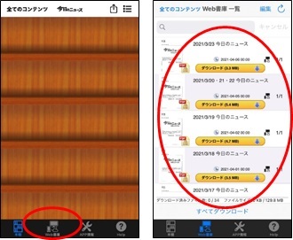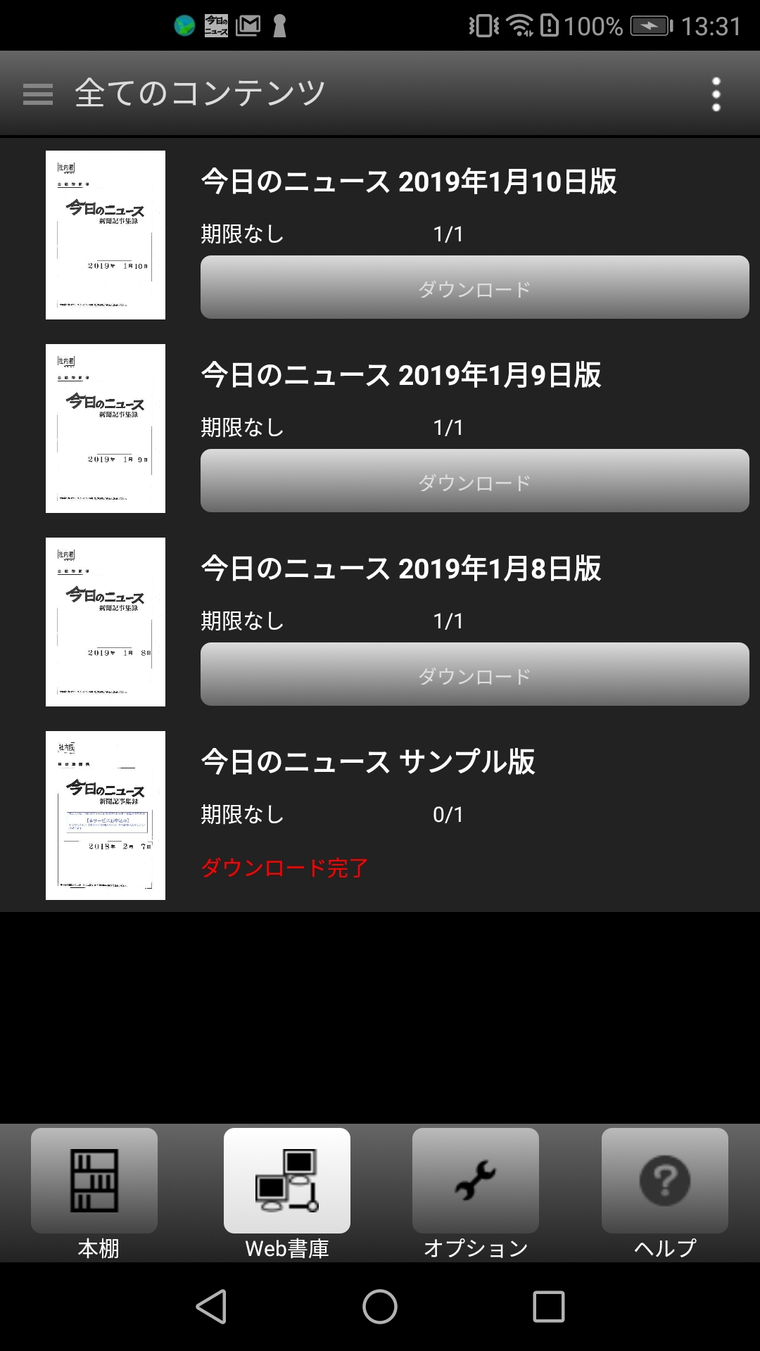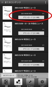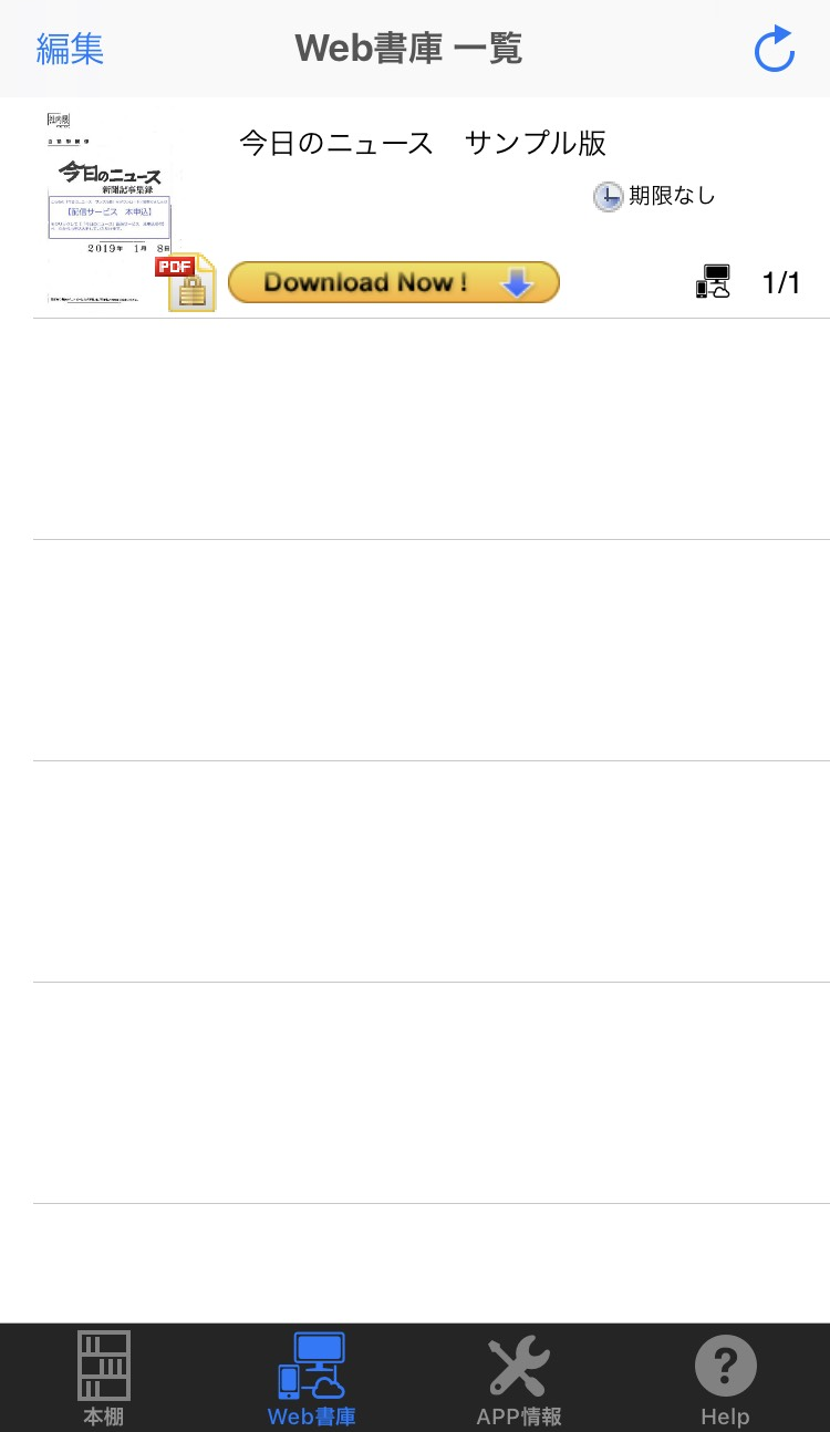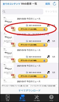 4 PINコード認証後Web書庫を開くと閲覧確認用の「今日のニュース」サンプル版が並んでいるので、アプリの本棚にダウンロード