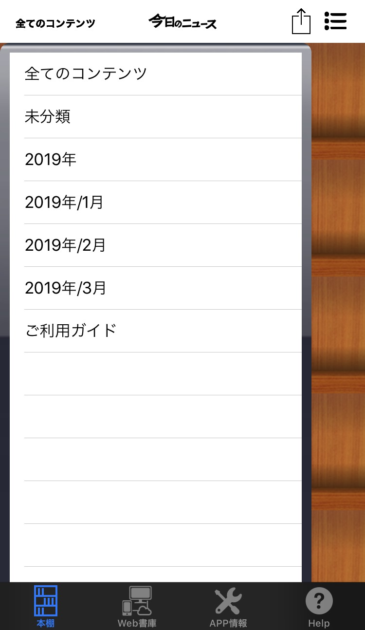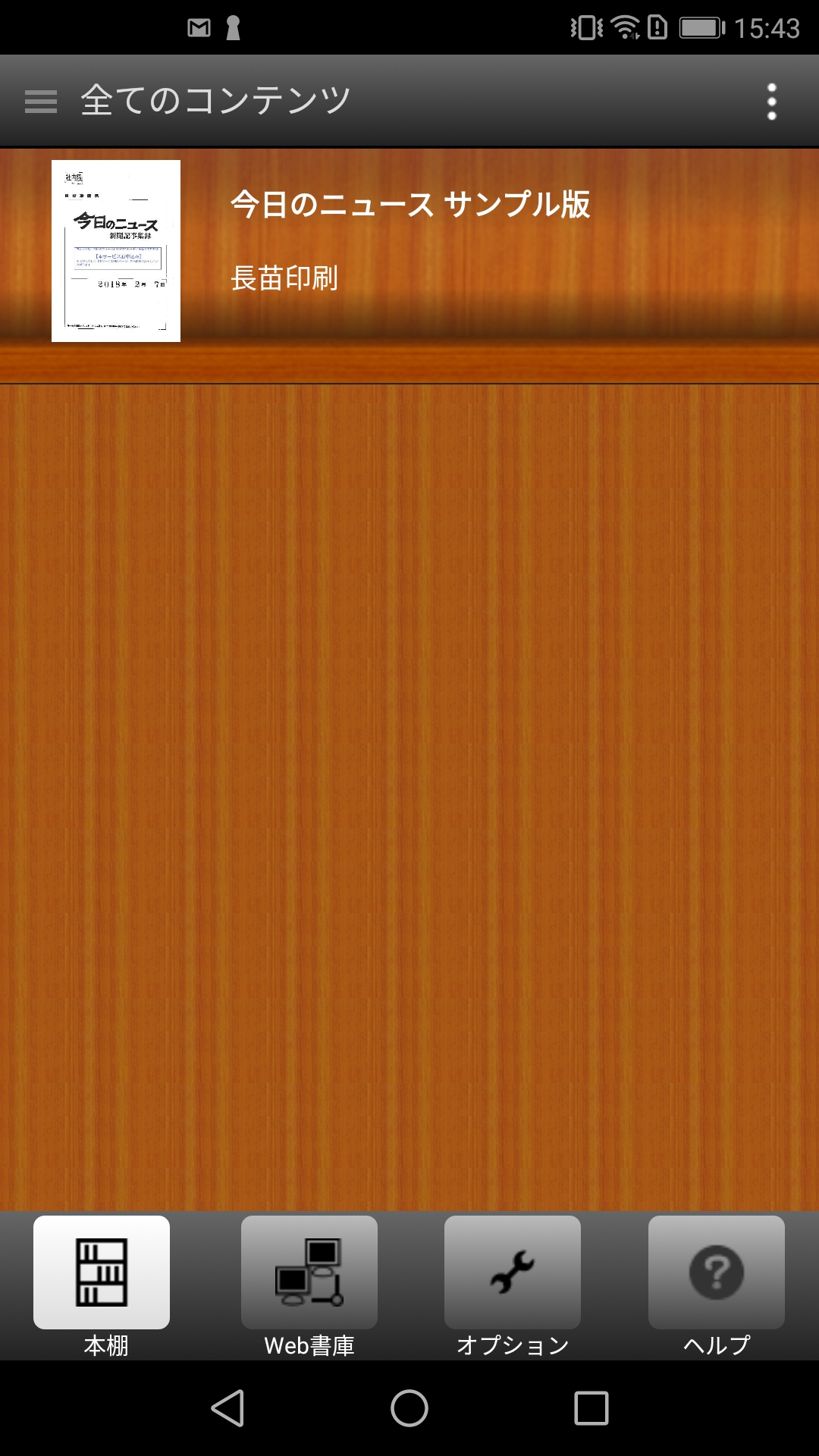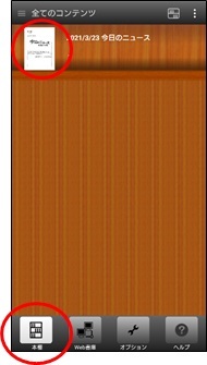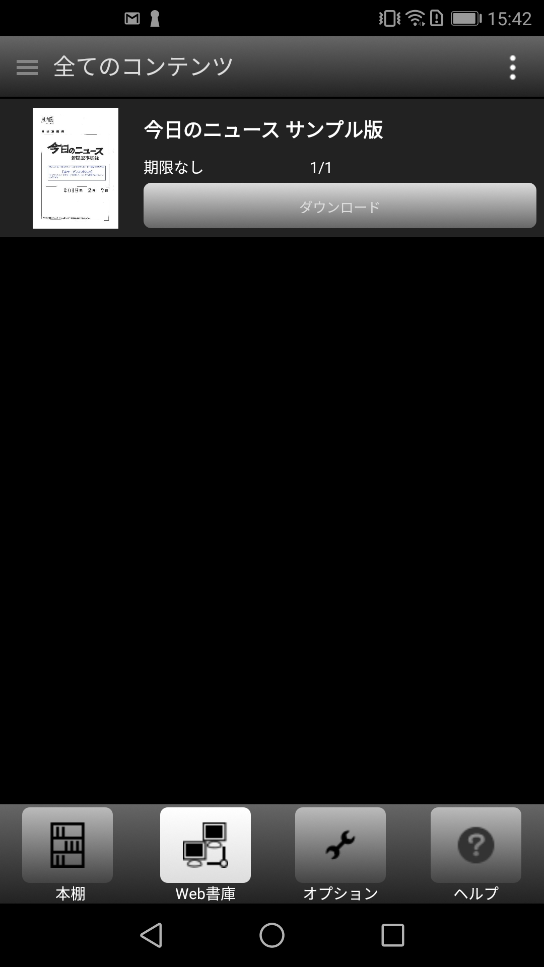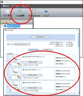 4 PINコード認証後Web書庫を開くと閲覧確認用の「今日のニュース」サンプル版が並んでいるので、アプリの本棚にダウンロード