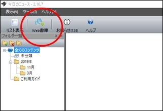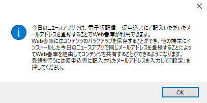 1-1 「今日のニュース」アプリ(Win版)を初めて起動すると、Web書庫登録を促すメッセージが表示されるので、メッセージに従って「OK」をクリック