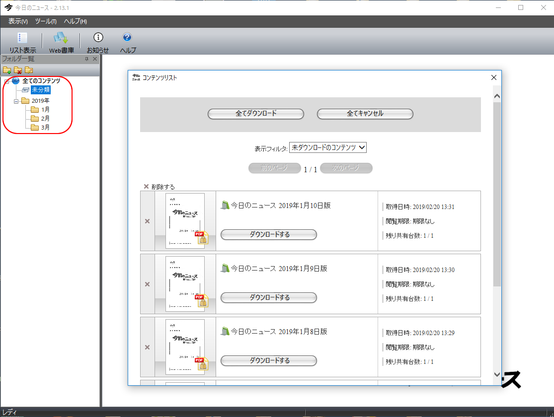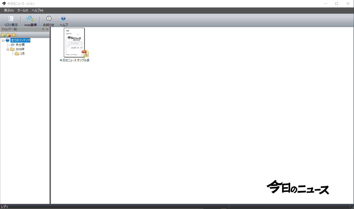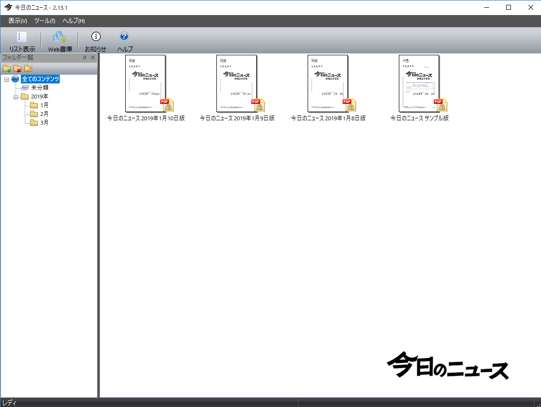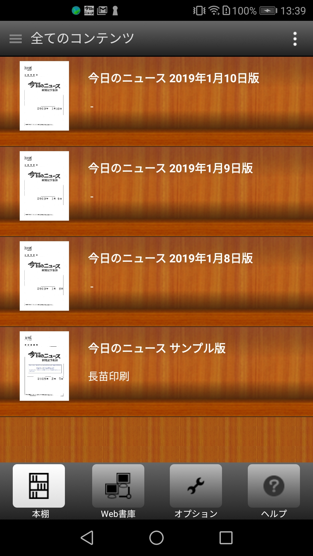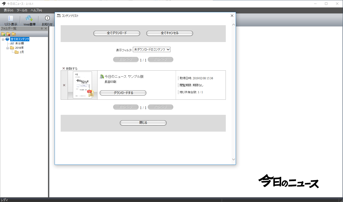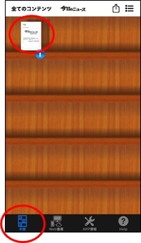 閲覧確認用の「今日のニュース」サンプル版が並んでいるので、アプリの本棚にダウンロード