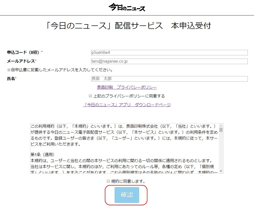 8 「本申込」の入力フォームに「申込コード」「メールアドレス」「氏名」を入力し、プライバシーポリシーおよび利用規約に同意したうえで確認ボタンをクリックし、入力内容確認ページへ