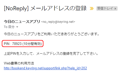 入力したアドレスに数字5桁のPINコードが送られてくる