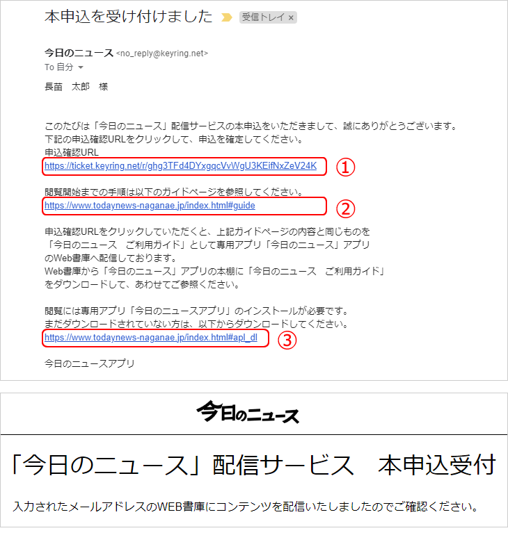 仮申込受付完了。このタイミングで購読希望者のメールアドレスのWeb書庫に「確認用サンプル」が配信されます。