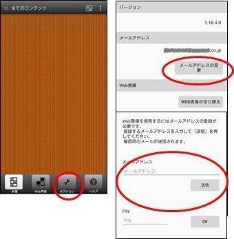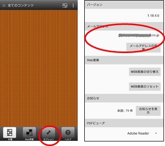 画面下部メニューにあるオプションをタップして表示されるメールアドレスを確認