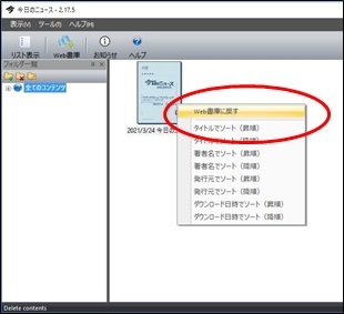 Web書庫に戻したいダウンロード済のコンテンツを右クリックし、表示されるプルダウンメニューの「Web書庫に戻す」を選択し、確認画面のOKをクリック