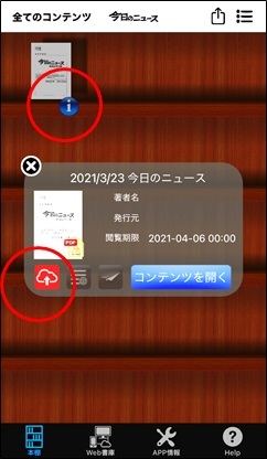 本棚に表示されているWeb書庫に戻したいダウンロード済のコンテンツのⓘをタップする 赤いクラウドのアイコンをタップし、確認画面のOKをタップする