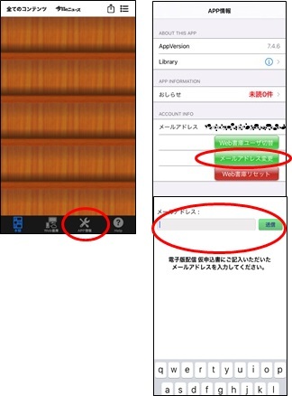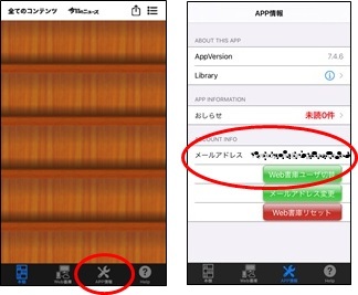 画面下部メニューにあるAPP情報をタップして表示されるメールアドレスを確認